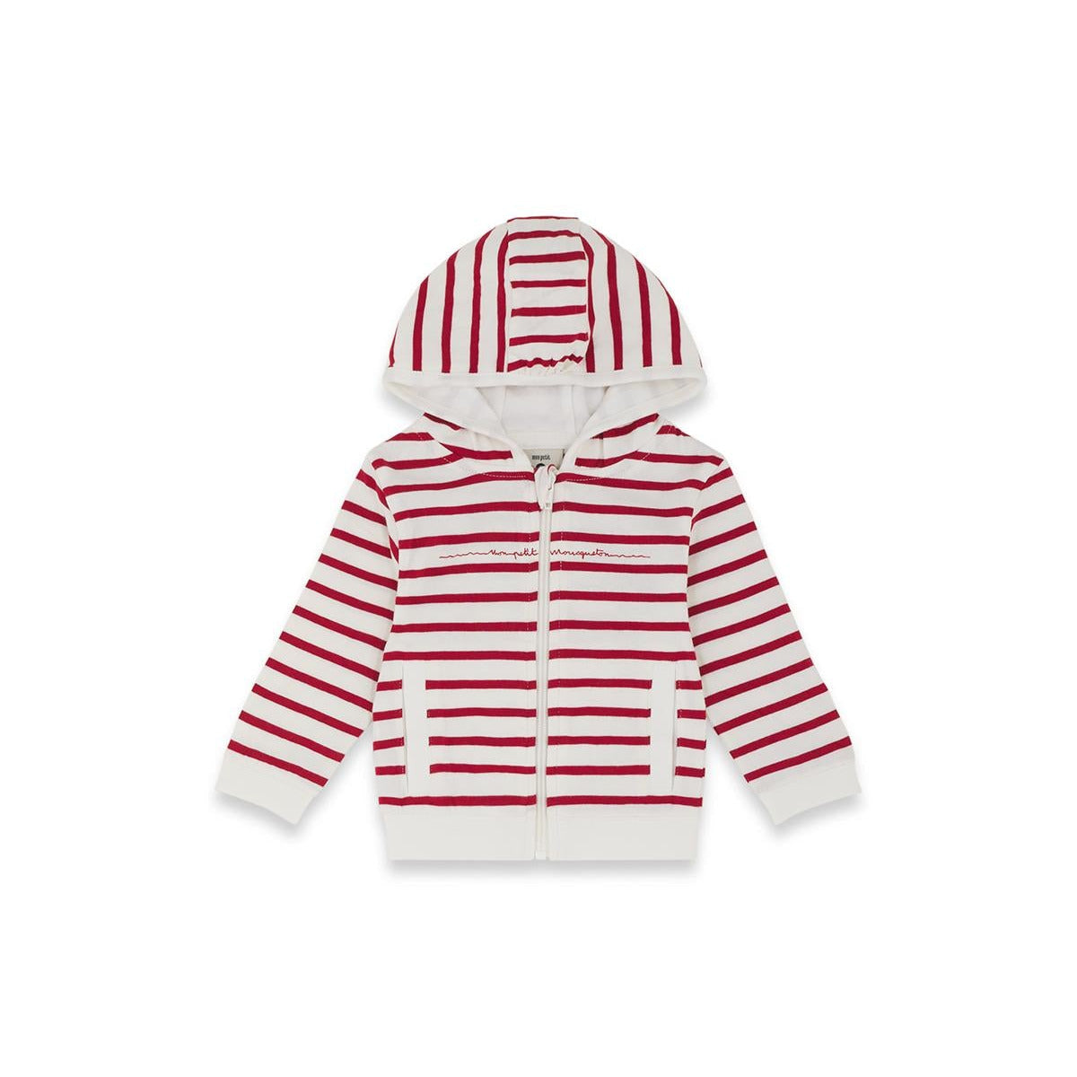 Striped baby hoodie with zip front in a soft 100% jersey cotton, 200g. Wash on a delicate 30 degrees cycle.