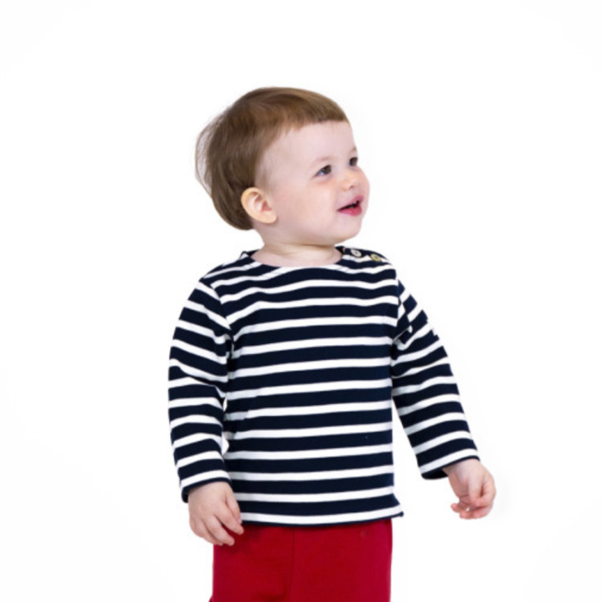Breton style striped baby top with button fastening. Made from 100% high quality jersey cotton, 285g. Wash at cool 30 degrees.